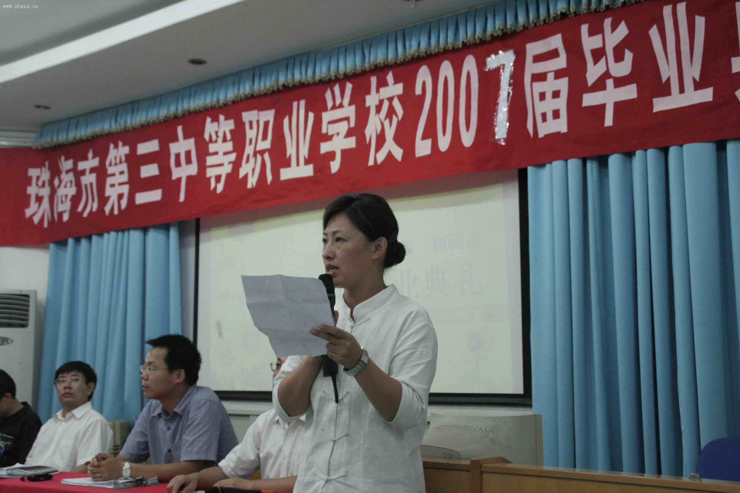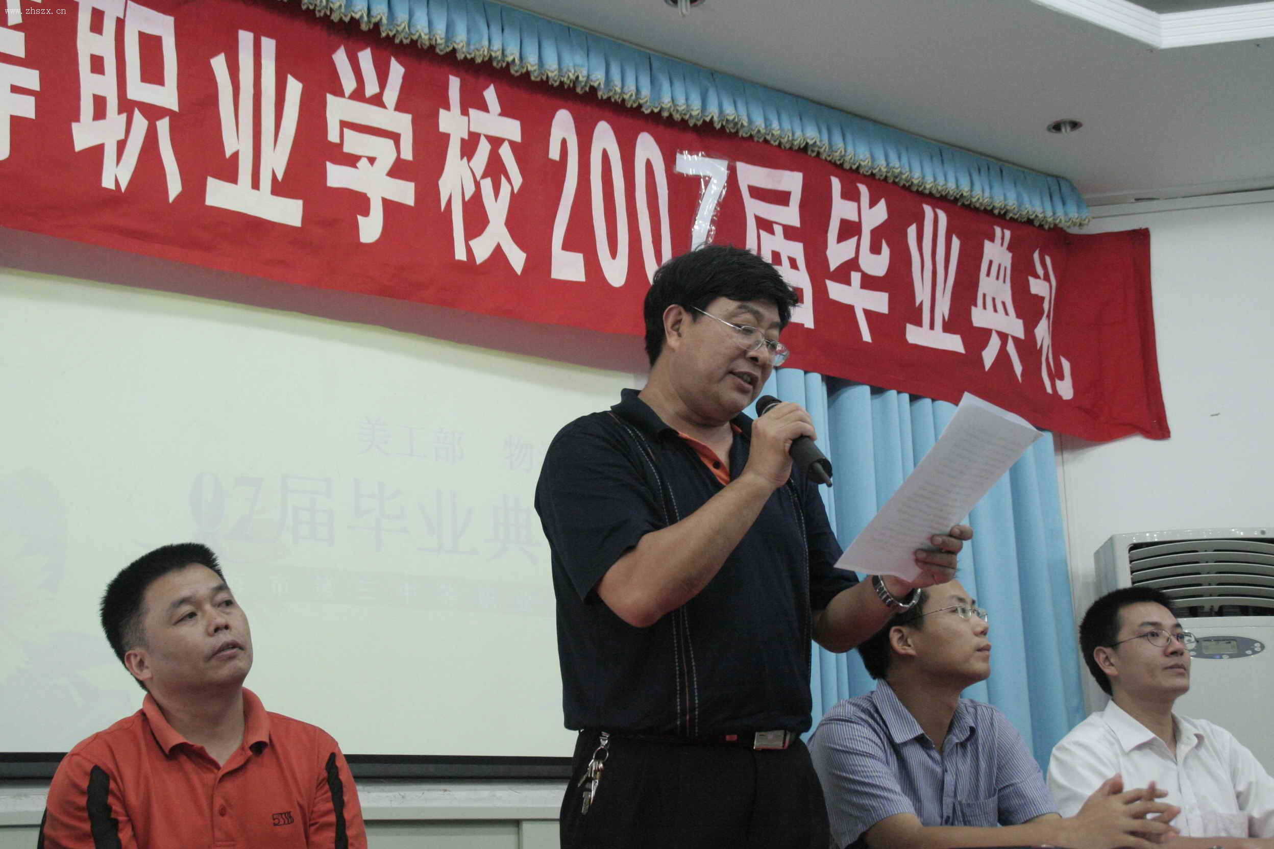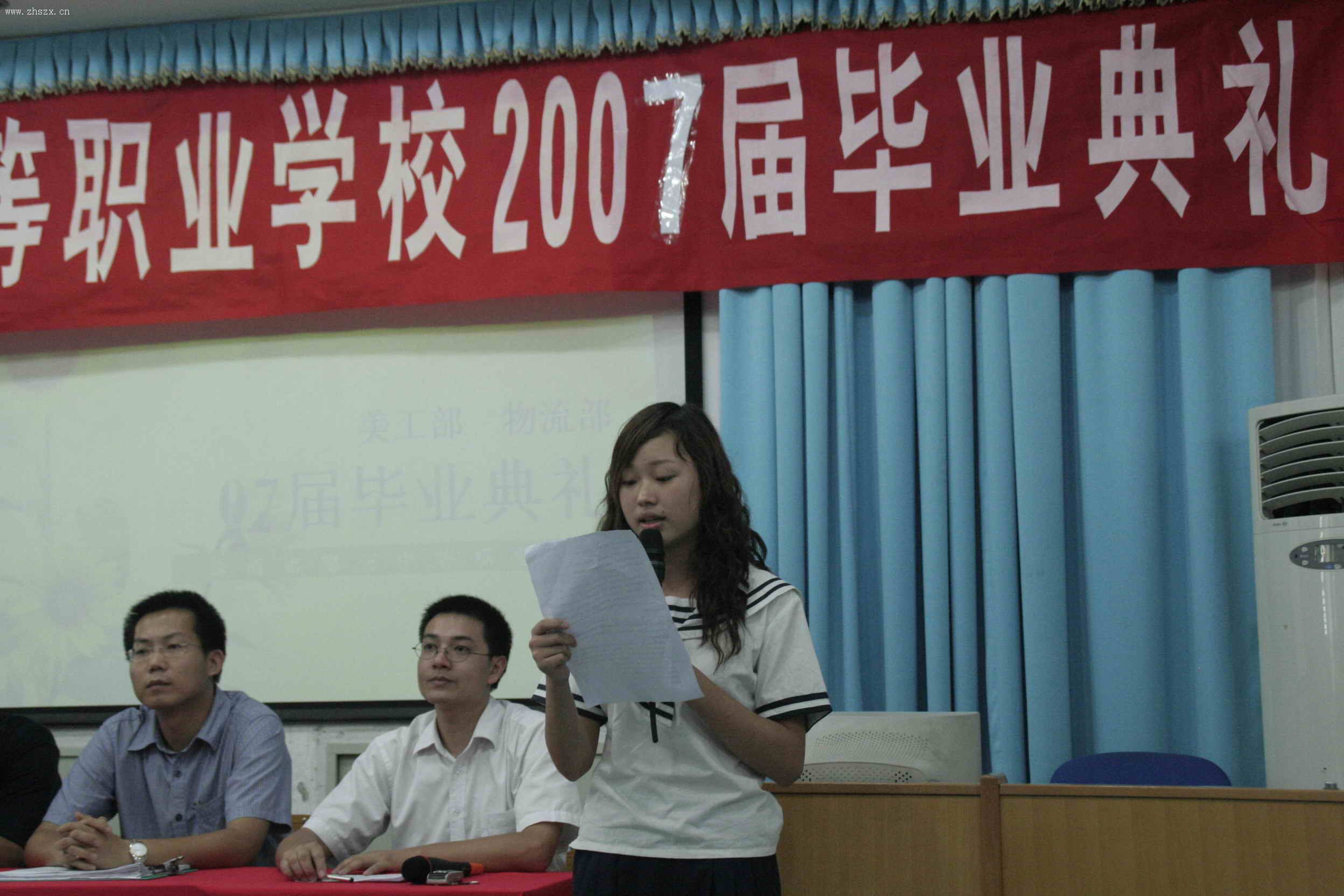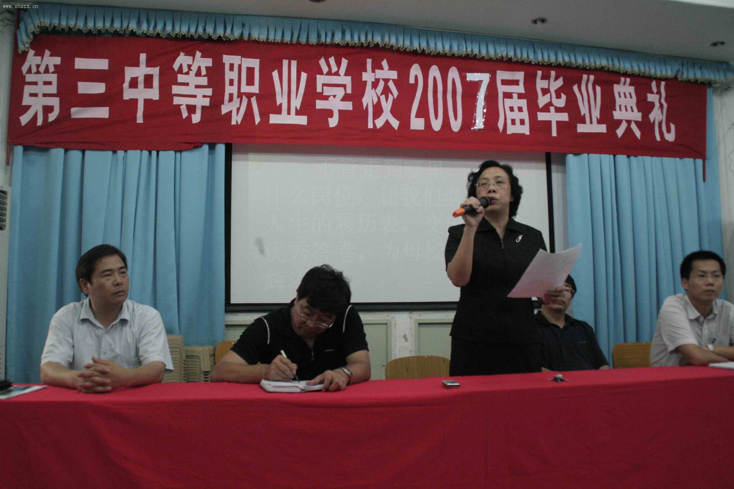 校长詹红红在毕业典礼上发表了热情洋溢的讲话,他首先对全校毕业生圆满完成学业、顺利毕业表示了热烈的祝贺。她指出,过去的三年,516位毕业生同学们在老师的教育帮助下,经过自己的艰苦努力,在“学会做人、学会生存”方面得到了全面培养和不同程度的提高。他们为05、06级的同学树立了榜样,也给学校办学史上留下了光荣的一页。詹校长寄语广大毕业生:希望全体毕业生真诚做人,用心做事;开拓创新,志存高远;情系三职,关注母校。