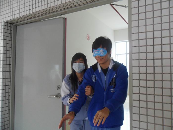 近日,我校南校区心理协会开展了一年一度的雷锋月活动之“我的非常一天”心理体验日活动,报名参加的90位同学在南校区实训楼12楼领取活动道具后,开始了一天的体验。在这一天的时间中,除了上课时间,三人中的一人必须以眼罩蒙眼,模拟盲人;一人带上口罩,模拟哑巴;一人为正常人,负责协助其伙伴完成任务,并保障其安全。三人除了要完成日常学习和生活外,还要完成一些指定的任务:如采访班主任,了解他的工作内容;采访一位学生会干部,了解他在工作中遇到的问题;收集5位同学对日本地震的祝福等等。