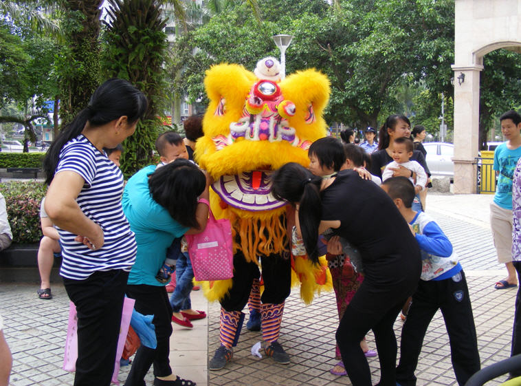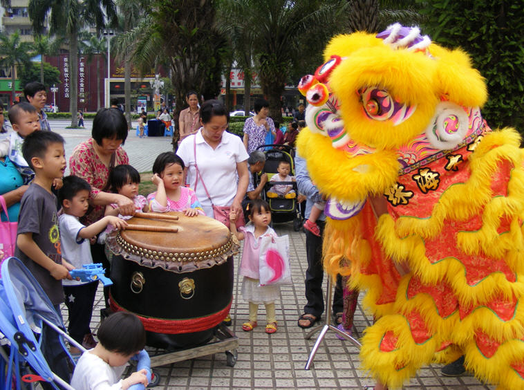 在拱北岭南社区的春晖公园,老老少少里三层外三层地围着我校龙狮社的同学们。“没想到这个狮头这么重啊,舞起来还真需要些力气”,“哥哥,我可不可以摸一下狮子的眼睛呢”,市民们一边饶有兴致地摆弄着平日里只能“远观”的醒狮行头,一边向同学们讨教各种问题。9岁的轩轩不但拿起鼓棒,有模有样地敲起了大鼓,还囔囔着要“拜师”。在市民热情的簇拥下,龙狮社的同学们腼腆地给大家一一讲解舞龙醒狮的传统,以及技术要领,并多次现场表演。