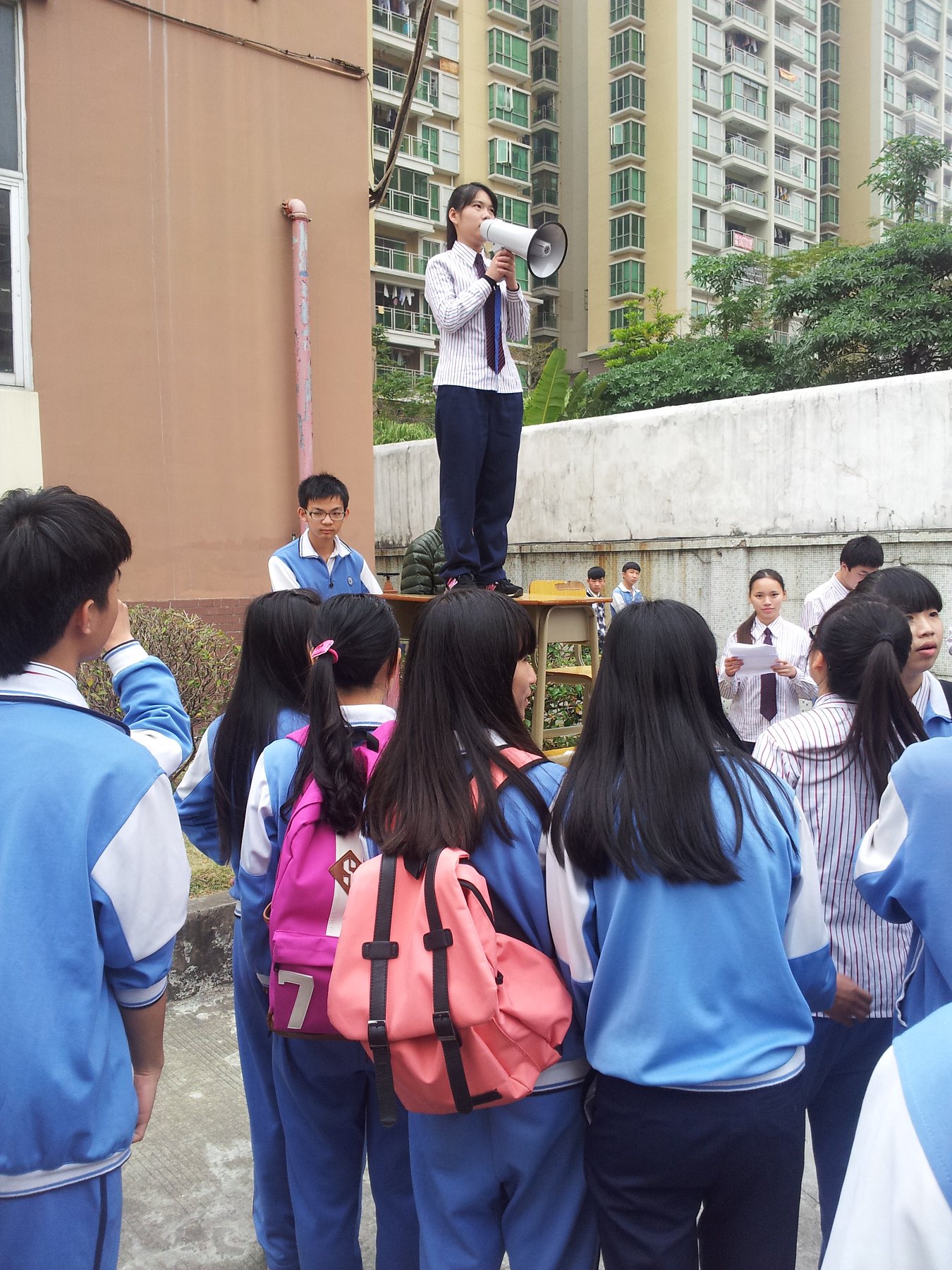 叠加着一张张课桌在学校食堂的演讲: