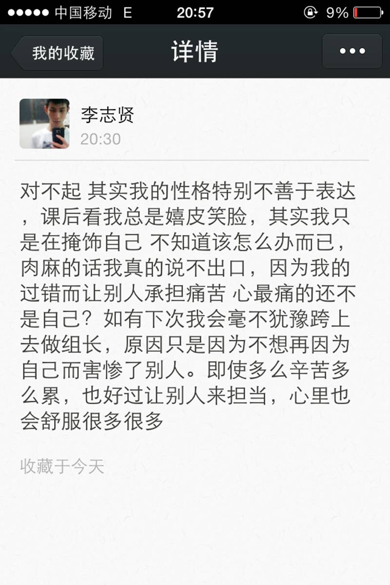 那天晚上,我们做了一个叫“责任的传递”游戏,老师让我们全班分成4个小组围成一个圈,并且每一个组派出一名组长,组长必须是自愿的,不管出现什么事情都要承担后果,游戏规则是:组员犯了错就由组长来承担。游戏开始时4位组长必须承诺:愿意为自己的团队负起责任,无论在怎样的情况下都无怨无悔!游戏开始几轮,因为每组组员都有犯错,组长必须做俯卧撑,开始那几轮俯卧撑做的并不算多,都有同学在小声的议论和笑。但是越往后气氛越严肃,渐渐的各位组长已经开始乏力了,组员们的情绪顿时变得很低落,看着组长因为自己的过错而受惩罚,心里便有一种说不出来的苦涩,在这时,已经有不少人眼眶渐渐湿润了,有不少人愿意站出来承担自己的过错,但最终每一位组长都愿意承担起这个责任……直到游戏结束,每一位同学都去安慰组长,跟组长说对不起,每一位同学都有深深的感触,大多数同学都把那天的感触发到了微信上。经历了那一个晚上后,很多同学都真正成长起来了,并懂得了责任的真正含义!