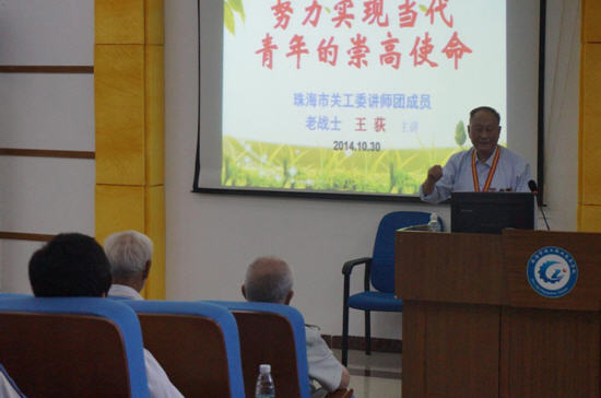 30日下午,我校120多位师生齐聚学校三楼阶梯教室,聆听珠海市广东游击老战士联谊会常务副会长、离休干部王荻带来的首场生动活泼、激情四射的革命传统教育课。