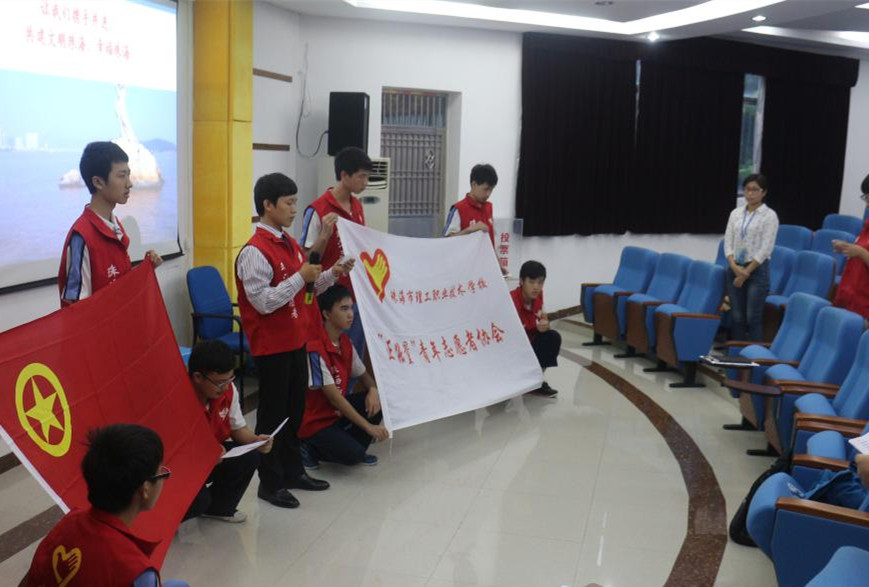 培训结束后,全体志愿者在团旗和珠海理工“正能量”青年志愿服务队旗前庄严宣誓:“我志愿服务珠海国际航展,弘扬珠海航展精神,践行志愿服务理念,积极进取、奋力拼搏,为祖国争光,为航展添彩。让志愿者的微笑成为珠海航展最好的名片。”