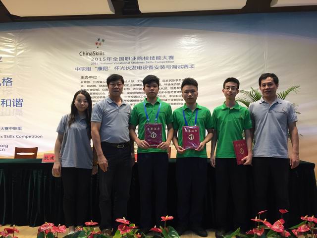 黄嘉良、梁振国、祝良杰获得光伏发电设备安装与调试项目三等奖,指导老师是邹旻、张箭