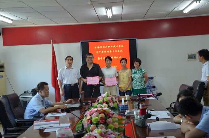 吴正玉主任首先代表学校宣读了香洲校区青年教师教学指导教师和班主任指导教师名单,学校为4位新教师聘任了师德好,业务水平高的优秀教师作为指导教师,其中教学指导教师任期两年,班主任指导教师任期一年。吴正玉主任对青年教师培养工作的指导思想、组织机构、具体方案和实施要点都一一作了详尽的解释和必要的说明,并组织学习了《青年教师指导与培养工作制度》、《珠海市理工职业技术学校教学常规》等学校规章制度。接着举行了简短而隆重的拜师仪式,青年教师逐一与指导教师见面及合影留念。