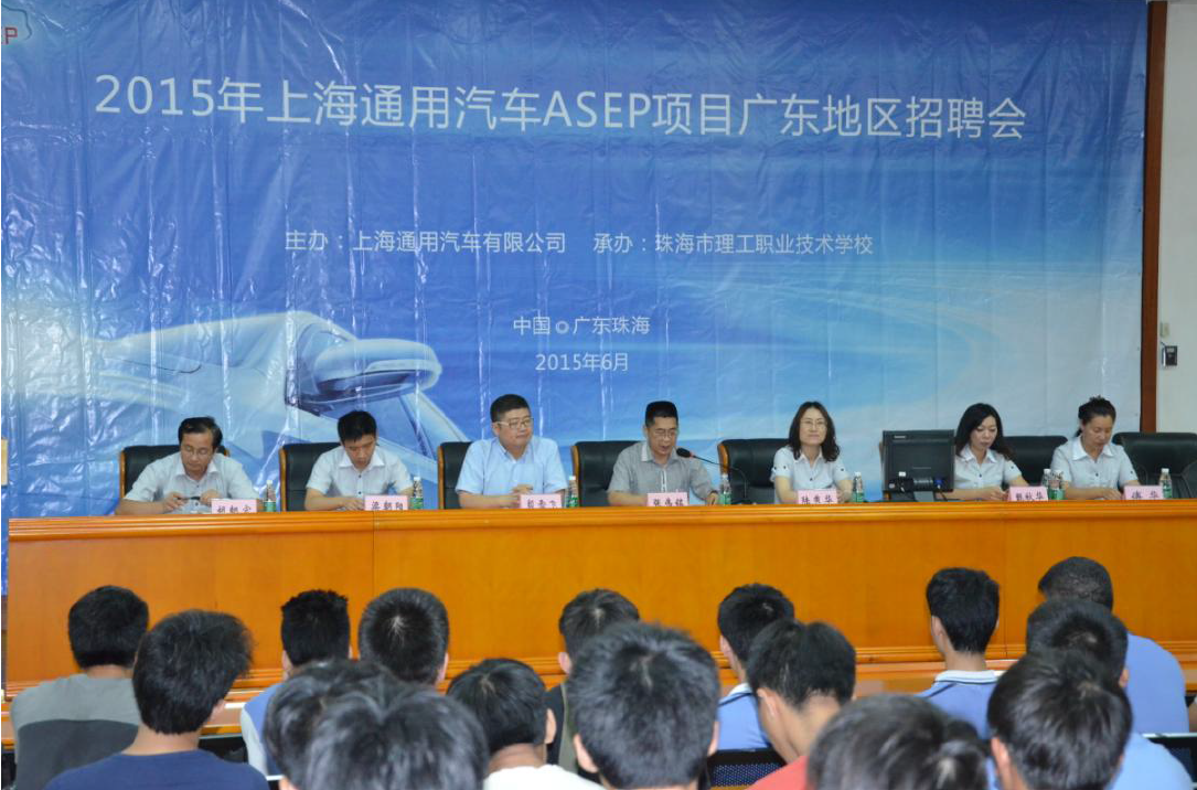 6月24日下午,上海通用汽车ASEP校企合作项目广东地区招聘会启动仪式在我校南校区12楼报告厅举办,上海通用汽车、安骅汽车集团、广州安骅汽车、珠海安骅汽车、珠海通兴汽车来我校招聘人才,55位2013级学生参加了本次招聘会。