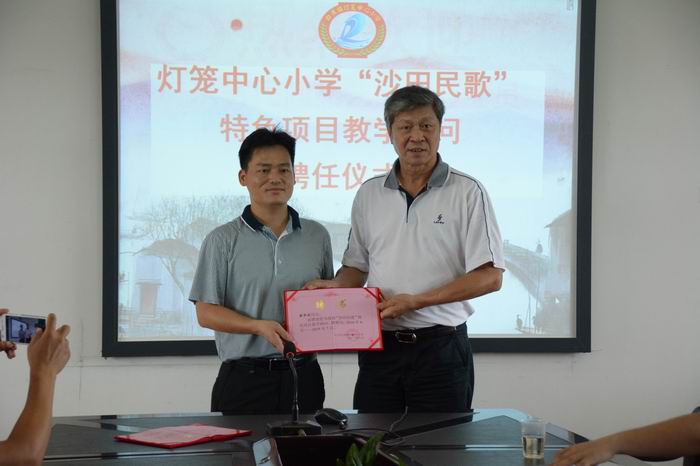2016年6月14日上午,“沙田民歌”特色项目教学顾问及校本教材主编聘任仪式在斗门区白蕉镇灯笼中心小学举行。白蕉镇灯笼中心小学王伟强校长、彭子贤副校长向我校“沙田民歌工作室”主持人、校党委黄华欢书记颁发了聘任证书。