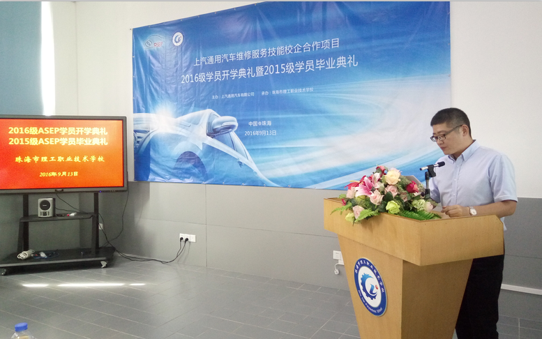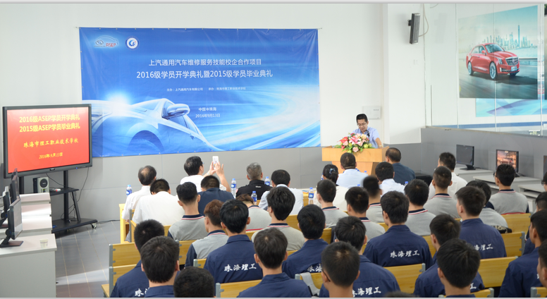 9月13日上午,我校与上汽通用汽车有限公司联合举办的“ASEP校企合作项目”2016级学员开学典礼暨2015级学员毕业典礼在南校区教学楼二楼通用汽车实训中心隆重举行。上汽通用汽车有限公司对此活动高度重视,该公司现场技术部薛峰经理、“ASEP校企合作项目”殷雪飞主管、技术顾问李红军老师专程从上海来校参加典礼。珠海安骅汽车有限公司作为通用汽车品牌经销商也派团队参会。