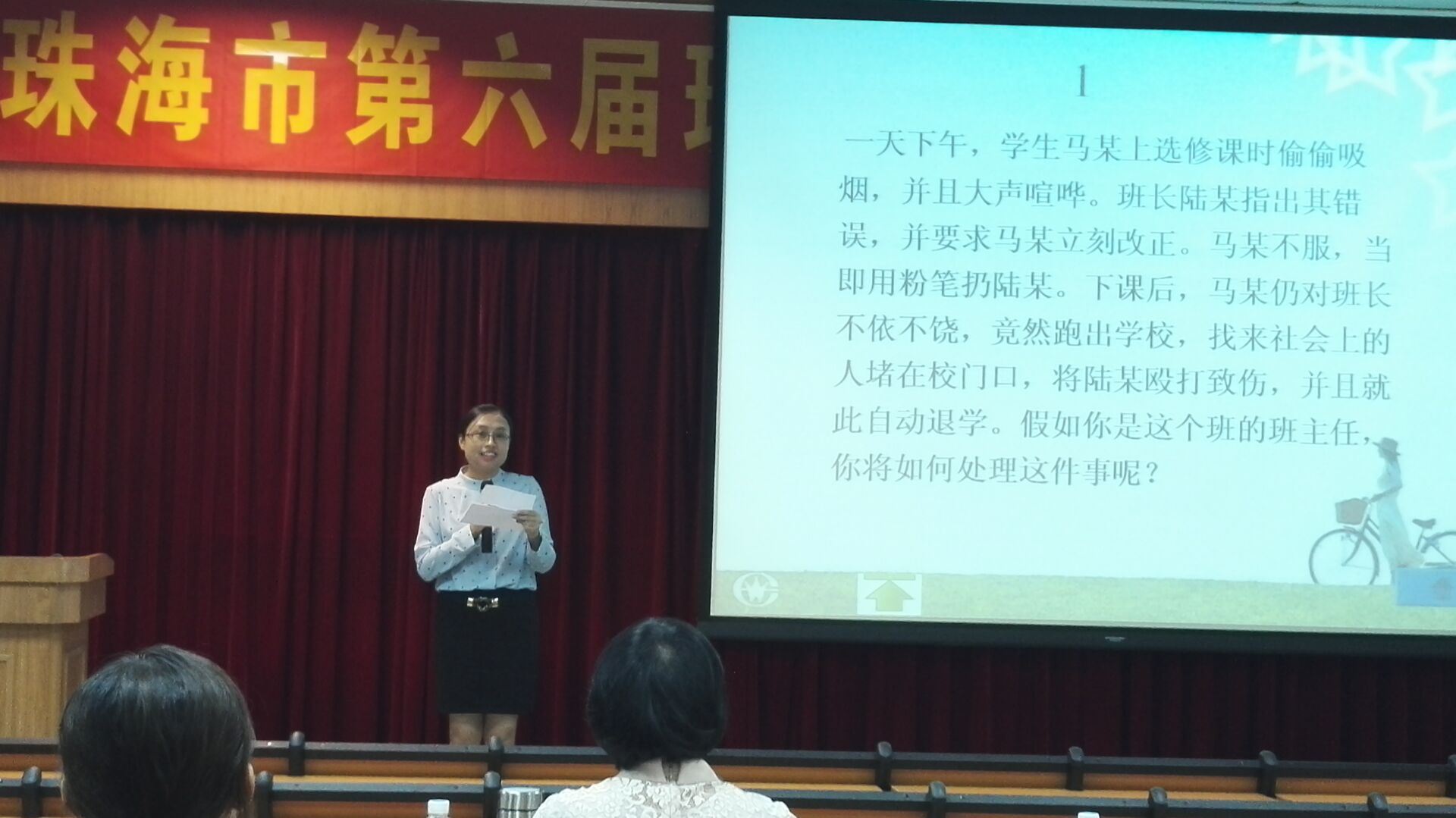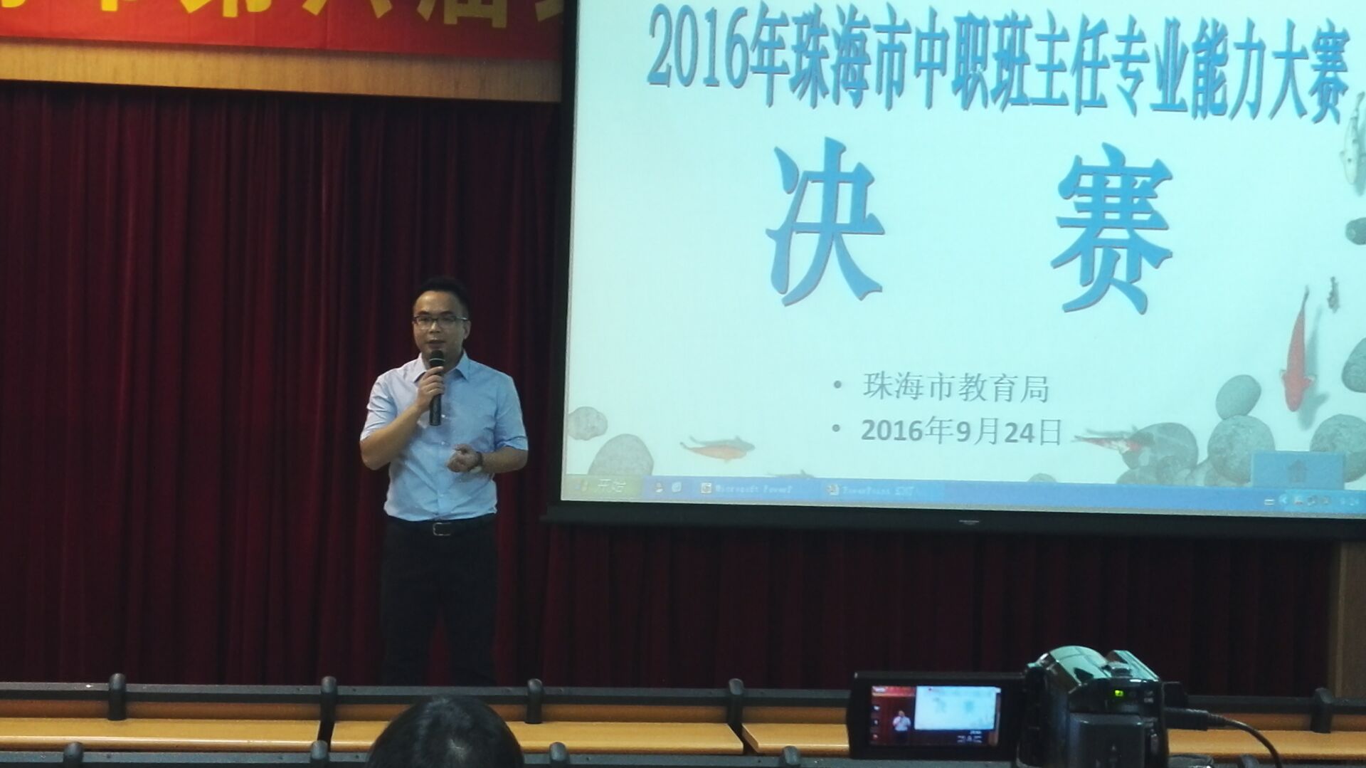 2016年9月24日上午,珠海市第六届班主任专业能力大赛中职组比赛在紫荆中学桃园校区精彩上演。我校香洲校区的程浩勋老师,斗门校区的周燕红老师参加了此次比赛,他们以超强的综合素质,扎实的班主任功底、出色的现场表现,赢得了现场评委与观众的一致好评。