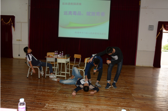 由吴健、林敏娜、陈金坡老师指导,15楼宇班李文杰、李文炜、朱善航、周琛、胡俊杰、曾宪钰、梁浩峰、李林青、孙海权九位同学自编自导自演的情景剧《毒害无穷》和《冲动的代价》,精彩、生动地展现了中职生在日常生活中容易遇到的两种经典情景,同学逼真传神的表演获得了场内阵阵掌声。随后,由斗门区人民检察院赵莉、袁冬华检察官分别对两个案例进行剖析和普法宣传,其中互动环节将活动现场气氛一次次推向高潮。