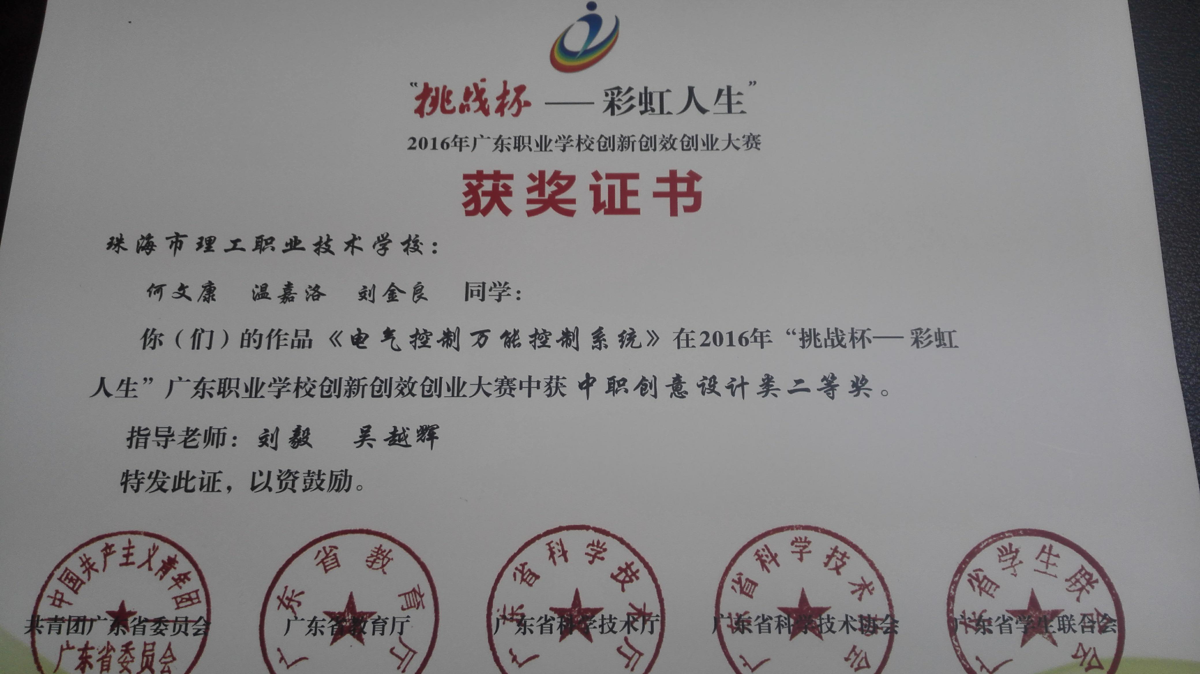 何文康 温嘉洛 刘金良 等同学获得中职组创意设计类作品“电气控制万能控制系统”获二等奖