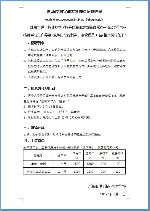自动控制实训室管理员招聘启事