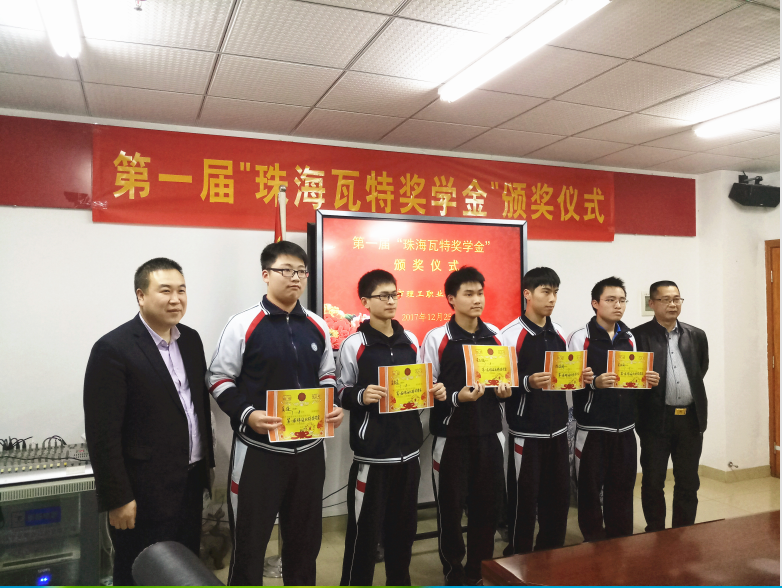 经过班级和专业部推荐、学校审核、珠海瓦特电力设备有限公司最后审批,我校电气专业新能源专业方向的5位同学获得第一届“珠海瓦特奖学金”,11位同学获得第一届“珠海瓦特资助金”。2017年12月25日下午,珠海瓦特电力设备有限公司人事行政部王刚经理和学校张伟铭校长在南校区九楼会议室共同为获奖学生颁发了第一届珠海瓦特奖学金和资助金。