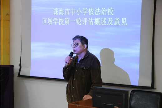 随后,市教研中心教研员、市依法治校创建工作评估组专家张建国作了题为《珠海市中小学依法治校区域学校第一轮评估概述及意见》的辅导讲座。从评估基本水平、指标数据分布、失分现象、工作意见等方面,对评估组前期工作所得出的阶段性结论作了归纳介绍,并提出下一阶段创建工作的建议。张主任在对珠海理工依法治校示范校创建工作给予充分肯定的同时,结合珠海理工实际工作将高分通过学校的主要措施归纳为:一是注重常规工作。由于平时工作到位,最后的总结材料质量高。二是创建工作保障得力。学校领导高度重视,各项工作都能够按照省市教育主管部门的规定及评分点要求逐一落实完成,并形成完备的材料。就下一阶段的创建工作他指出,学校领导应切实重视创建工作,加强评分标准的理解与提高材料质量,严格按照评分组梳理的问题整改。