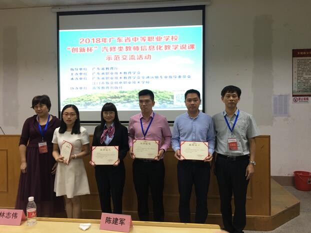 本次交流活动由广东省职业技术教育学会和高等教育出版社联合举办,旨在推动学校课程教学改革,创新教学方法与教学模式,促进教师素质与教学质量的提高。全省共有24位汽修专业教师参加了此次交流活动。在比赛中,我校教师自信大方,思路清晰,从教材、学生、教学方法及教学理念、教学过程等方面入手,全面地阐述说课内容;凭借独特的选题,流畅的讲解,精美的课件制作,过硬的教学基本功,赢得评委的一致认同。邱飞勇老师获一等奖,取得参加国赛资格;黄利强老师获三等奖。