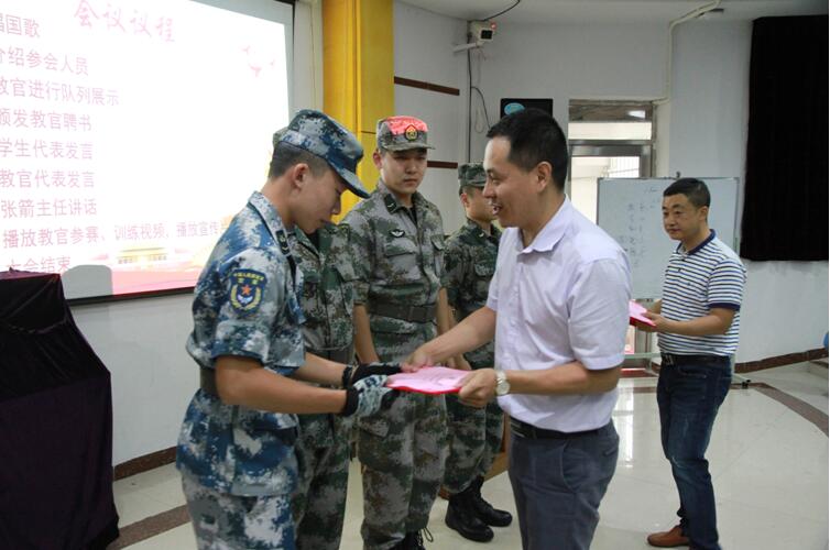 在雄壮的中华人民共和国国歌奏响之后,动员大会正式开始。首先由张箭主任代表学校为四位教官颁发聘书。接着学生代表发言,他表示一定会刻苦训练,发扬吃苦耐劳、顽强拼搏的精神,时刻以一名军人的标准严格要求自己。教官代表发言,希望同学们严格训练,服从指挥,并表示会将所学技能全部教授给我校国旗护卫成员。最后学生处张箭主任进行开训动员并强调训练纪律。