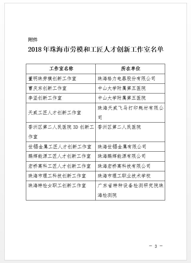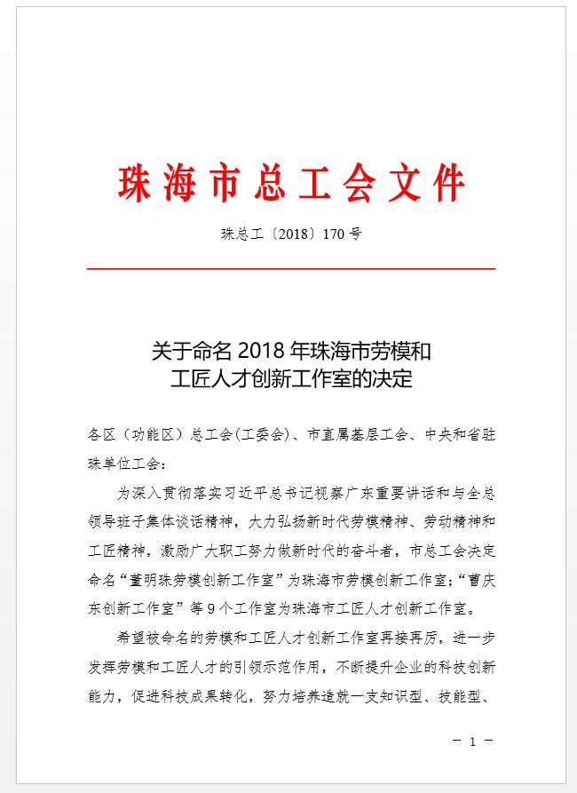 近期,珠海市总工会公布2018年珠海市劳模和工匠人才创新工作室名单,珠海理工学校科技创新工作室榜上有名,成为全市10个获此殊荣的工作室之一。我校是全市唯一一所获得工匠人才创新工作室称号的学校。名单中,董明珠劳模创新工作室雄踞榜首。
