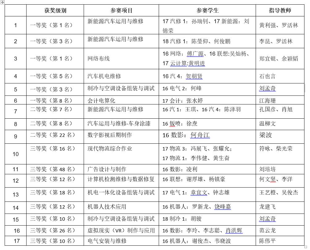 2018-2019年度广东省中等职业学校学生技能竞赛已圆满结束。经过选拔,我校共派出31名学生选手参加了14个项目的角逐,其中8个项目为团体赛,6个项目为个人赛。选手们认真备赛、沉着应战、发挥出色,最终斩获一等奖6个(10人),二等奖3个(4人),三等奖8个(17人)。在此对取得优异成绩的同学表示热烈祝贺,希望他们再接再厉,奋力拼搏,在更高一级的赛事中勇夺佳绩,为学校争光。同时感谢全体教职工对技能竞赛工作的大力支持。