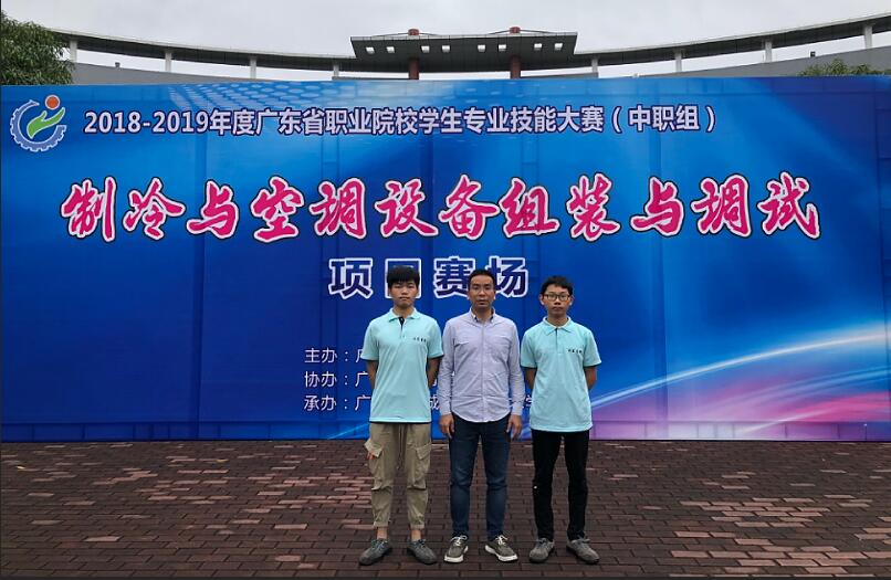 《制冷与空调设备组装与调试》项目 何峰同学(左一)获一等奖,指导老师 刘孟奇