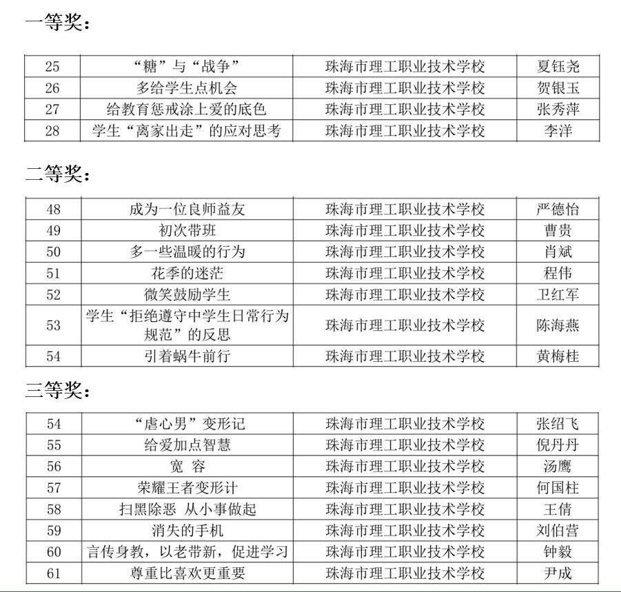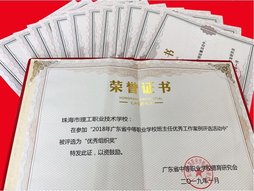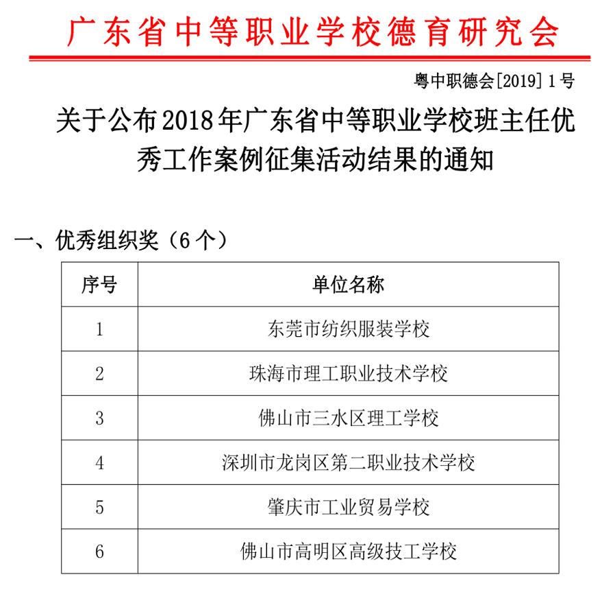 近日,广东省中职德育研究会公布了“2018年广东省中等职业学校班主任优秀工作案例的评选”获奖结果,此次评比活动,共有73所中职学校(包括技工学校)参加,共提交案例558份。我校班主任参赛积极性高,成绩显著,共提交57篇教育案例。获奖19篇,获奖率达30%。其中,有4位老师获得一等奖,7位老师获得二等奖,8位老师获得三等奖。我校获得优秀组织奖。