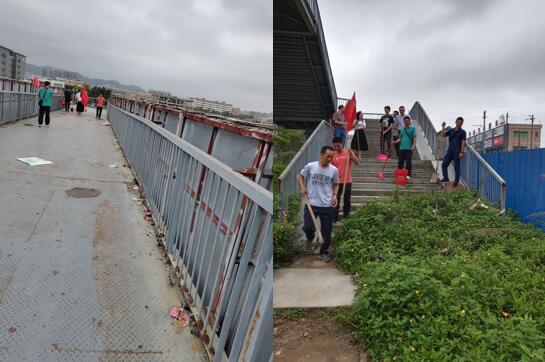 经过党员们一个多小时的奋战,天桥的入口和天桥桥面整洁干净,利于师生安全出行。
