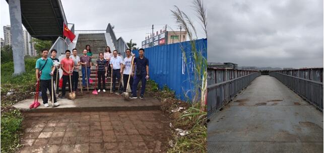 4月28日上午10:30,支部12名党员准时齐聚天桥底下,经过1个多小时的努力,天桥变得整洁干净,入口处变得宽敞明亮,使师生更加方便、安全上下天桥。