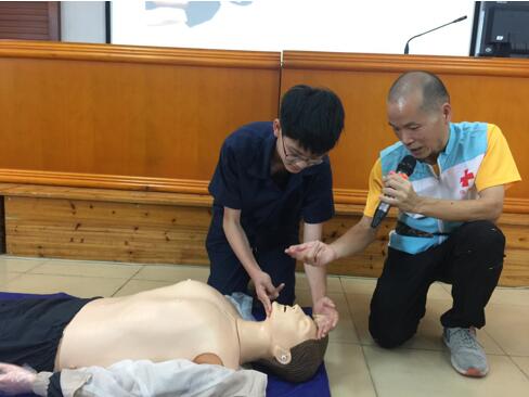 培训过程中,红十字培训中心的老师给同学们讲解了红十字的由来,让同学们对红十字有更深入的了解,生动地讲解并演示了现场急救的原则、创伤止血、心肺复苏、气道梗阻的急救,还给同学们实操的机会。