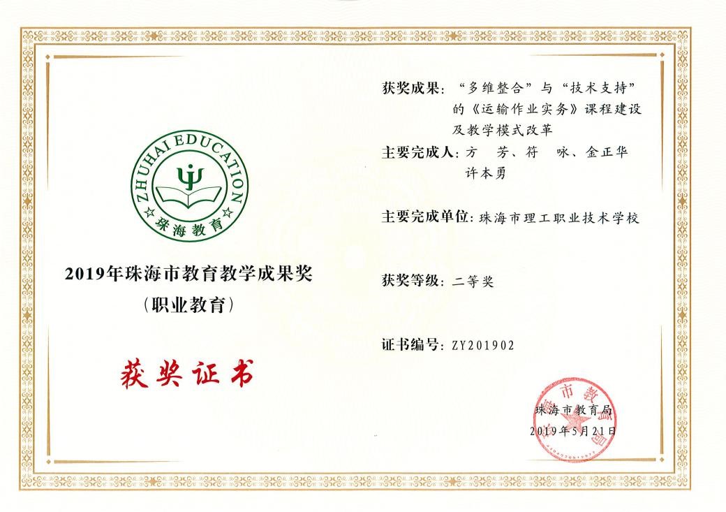 近日,2019年珠海市基础教育教学成果奖出炉,我校两个项目《基于“校本精品课程”的做学教一体化教学模式的研究与实践》和《“多维整合”与“技术支持”的《运输作业实务》课程建设及教学模式改革》均获得基础教育教学成果奖中职教育类二等奖。