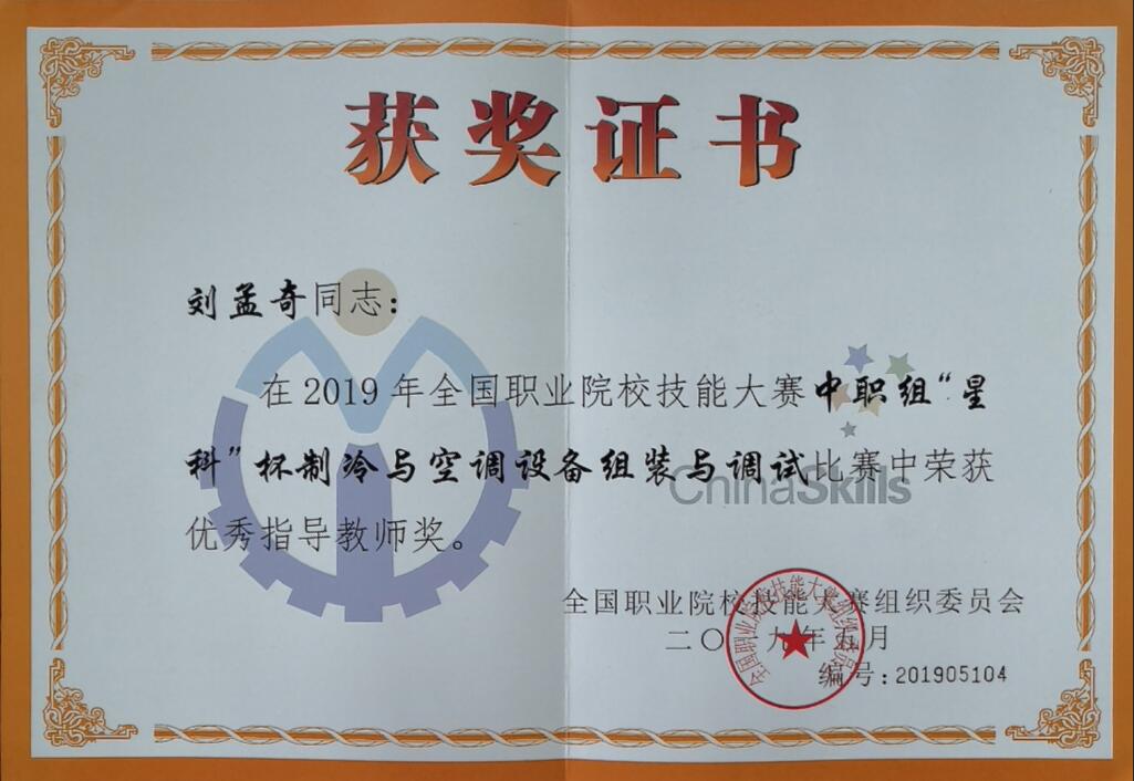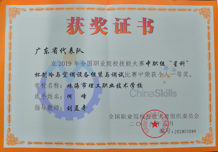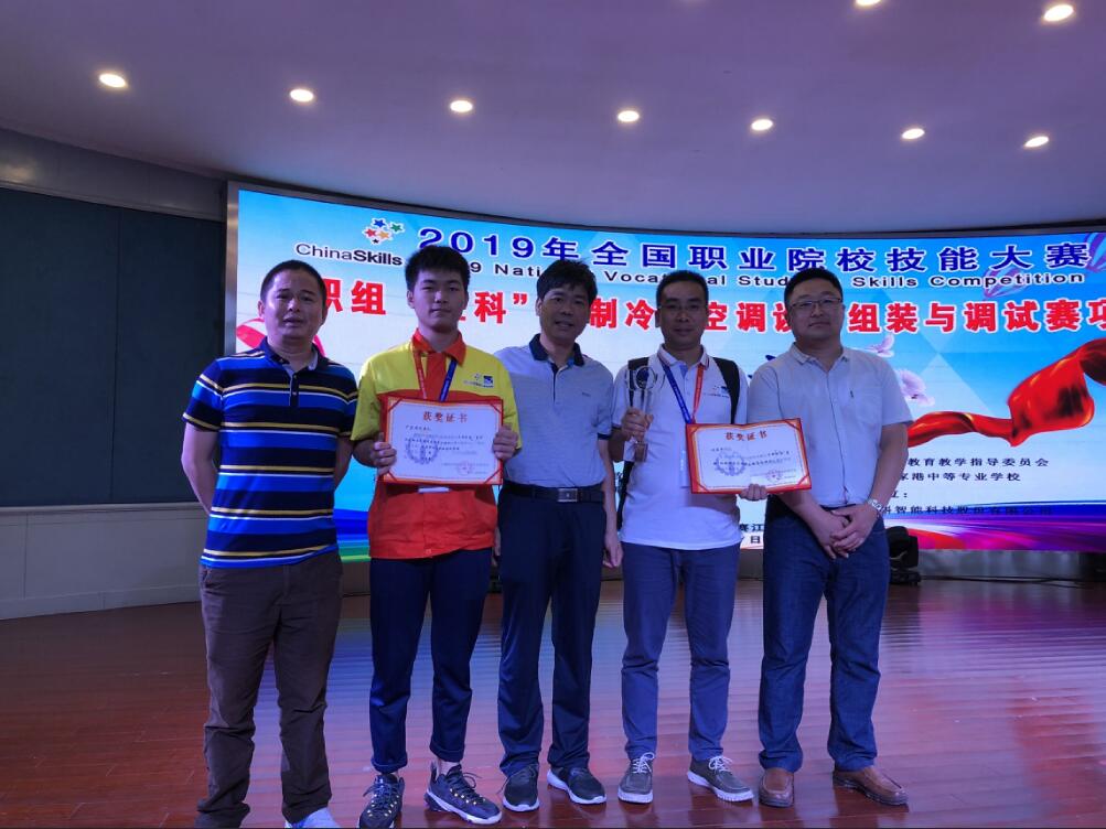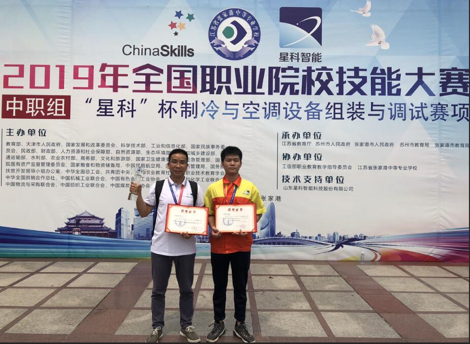 5月25-27日,2019年全国职业院校技能大赛中职组“制冷与空调设备组装与调试”赛项在江苏张家港中等专业学校举行。来自全国31个省、直辖市、自治区的111支代表队同台竞技。我校何峰同学获得该项目全国技能大赛一等奖,为广东队斩获一枚国赛金牌。刘孟奇老师荣获该赛项优秀指导老师。